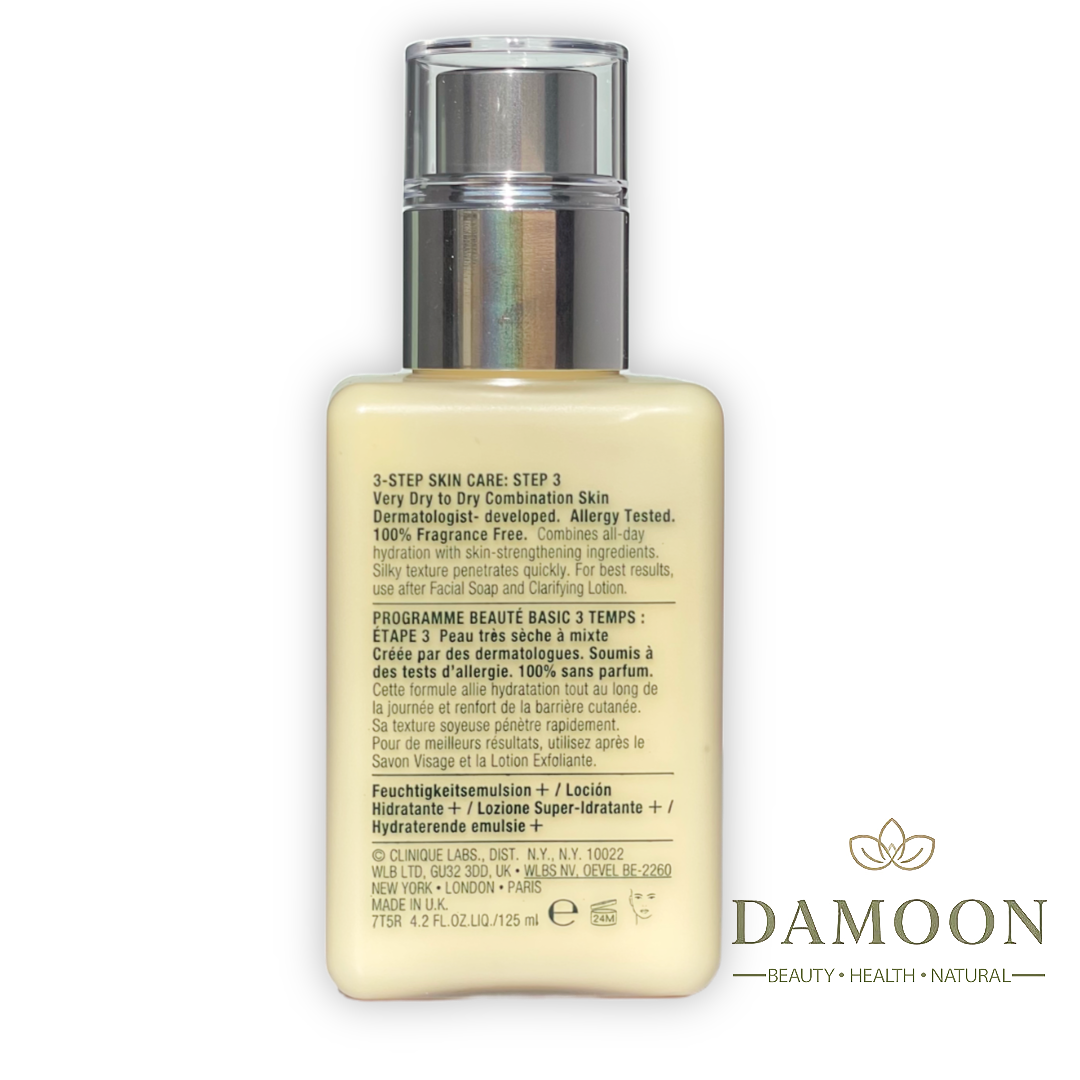لوسیون مرطوبکننده Dramatically Different از برند آمریکایی کلینیک (Clinique)، محصولی کلاسیک و پرفروش برای پوستهای خشک تا خیلی خشک و ترکیبی خشک است. این لوسیون با فرمولاسیون سبک و غنی از گلیسیرین، هیالورونیک اسید و عوامل مرطوبکننده طبیعی (مانند جو، آفتابگردان و خیار)، رطوبت را تا ۸ ساعت حفظ کرده و از تبخیر آن جلوگیری میکند. سد دفاعی پوست را تقویت نموده و پوست را نرم، لطیف و درخشان میسازد بدون ایجاد حس چسبندگی. فاقد عطر، رنگ و مواد حساسیتزا، تستشده درماتولوژیک و آلرژیزا. حجم ۱۲۵ میل با پمپ آسان، آن را برای استفاده روزانه ایدهآل میکند. مناسب تمام سنین و پوستهای حساس، و بخشی از سیستم ۳ مرحلهای کلینیک.