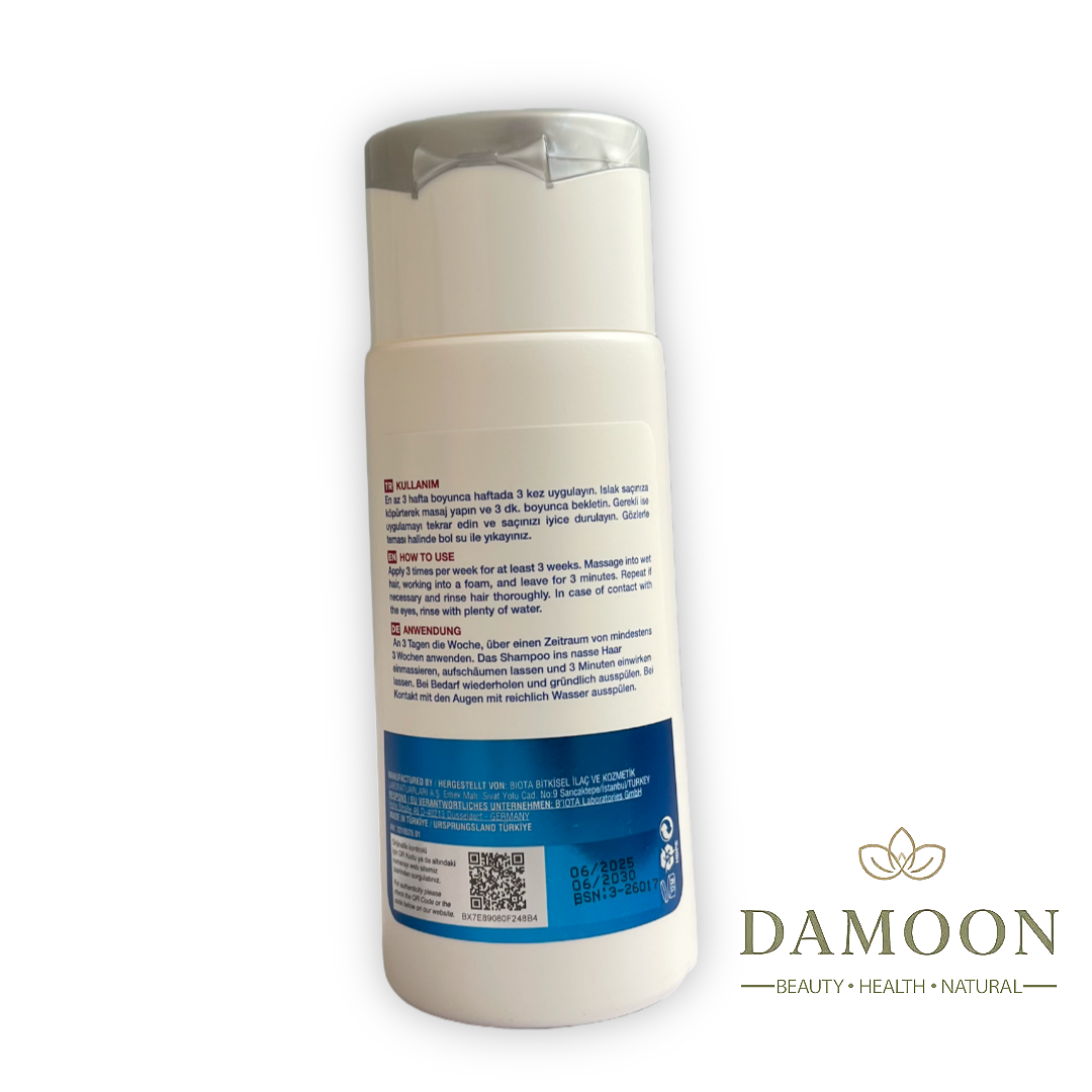 ۳. ۳-۵ دقیقه صبر کنید تا مواد فعال جذب شود، سپس با آب فراوان آبکشی کنید. برای شوره شدید، ۲-۳ بار در هفته استفاده کنید و حداقل ۶ هفته ادامه دهید.