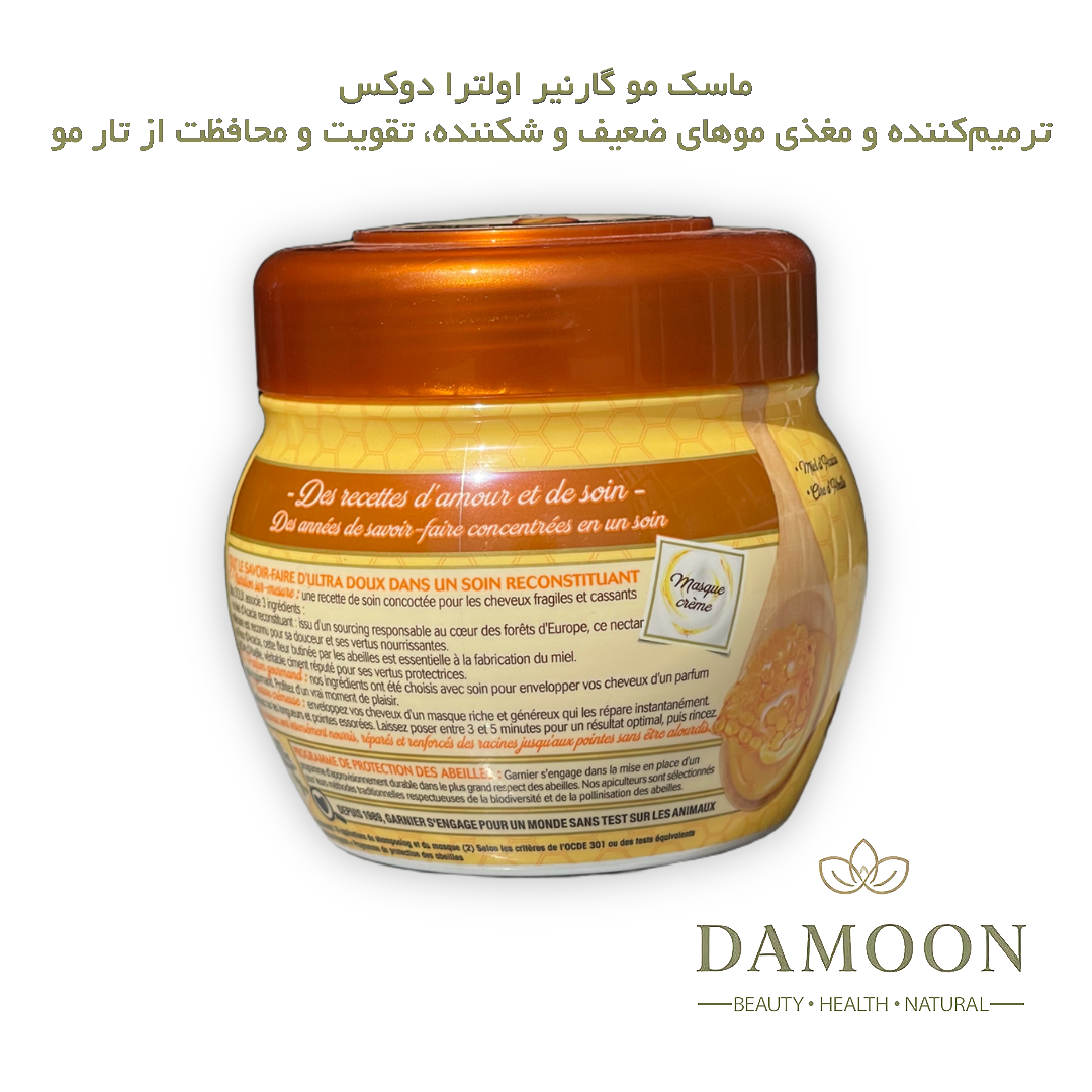 ماسک مو تعمیرکننده گارنیر اولترا دُوکس Tres Miel de Miel، محصولی طبیعی از برند فرانسوی گارنیه، با فرمول غلیظ حاوی عسل طبیعی و پروتئینهای زنبور عسل برای بازسازی عمیق موهای شکننده، خشک یا آسیبدیده (از حرارت، رنگ یا محیط) طراحی شده و ۹۵% مواد طبیعی (مانند اکالیپتوس و گلیسیرین گیاهی) برای تغذیه، محافظت و کاهش وز عمل میکند. این ماسک موها را تا ۱۰ برابر نرمتر و مقاومتر میسازد، گرهها را باز و درخشندگی طبیعی ایجاد مینماید، در حالی که زیستتخریبپذیر و بدون پارابن، برای پوست سر حساس ایمن است. hypoallergenic و تستشده بالینی، حجم ۳۰۰ میلیلیتری آن برای استفاده هفتگی کافی است و بخشی از سری Ultra Doux، با تمرکز بر مراقبت طبیعی و تعمیر. مناسب برای زنان و مردان با موهای آسیبدیده، برای موهایی سالم و پرجنبوجوش.